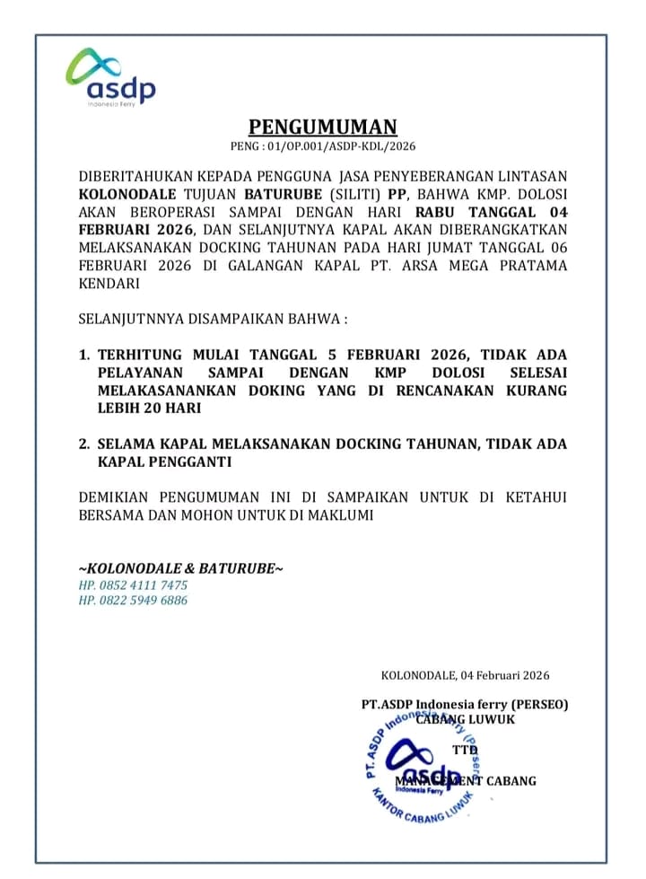 Pengumuman tersebut tertuang dalam Surat Nomor 01/OP.001/ASDP.KDL/2026 yang dikeluarkan manajemen ASDP Kolonodale. Dalam surat itu dijelaskan bahwa KMP Dolosi masih akan beroperasi melayani penumpang dan kendaraan hingga Rabu, 4 Februari 2026.